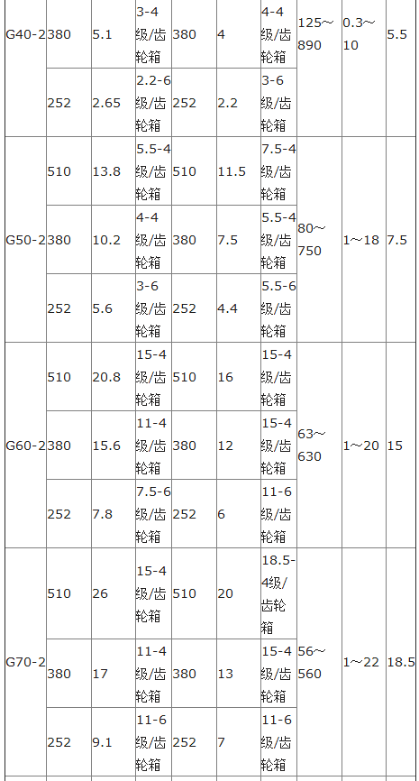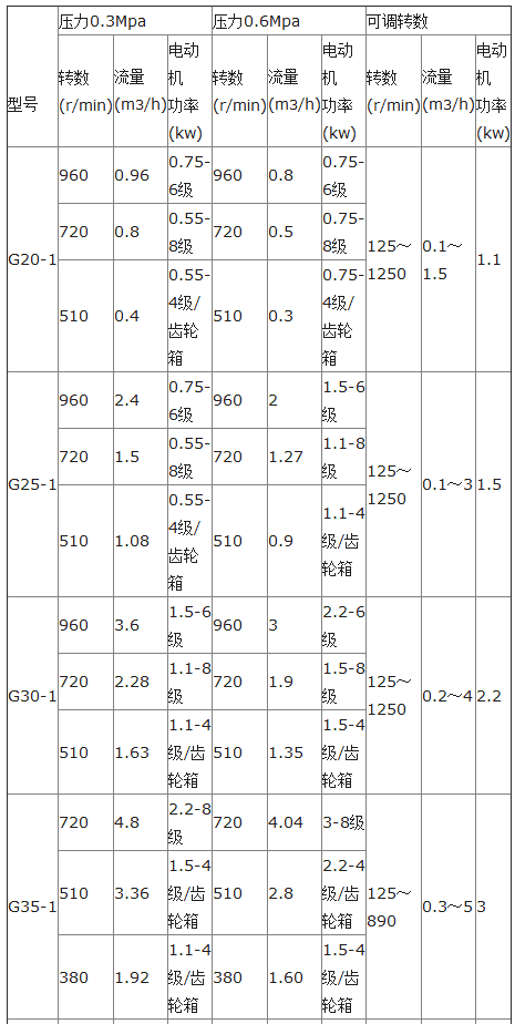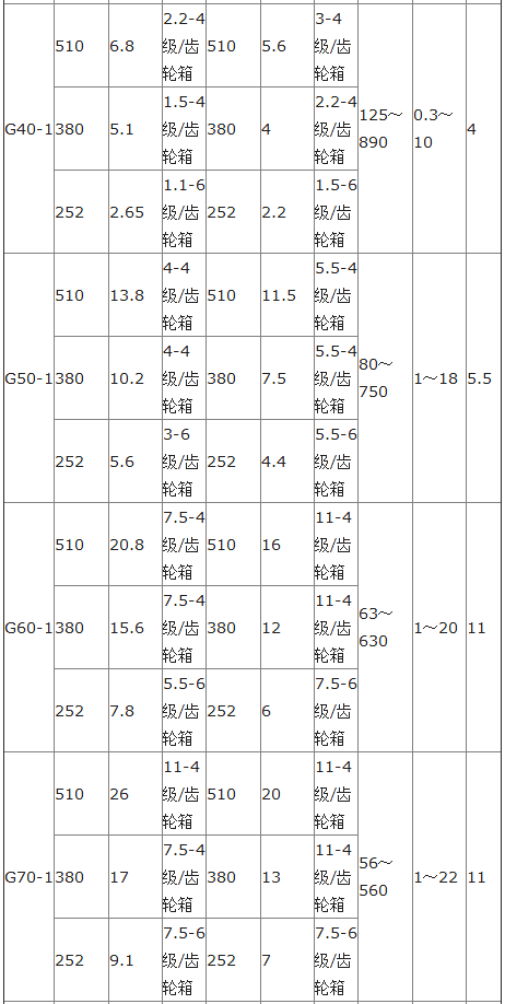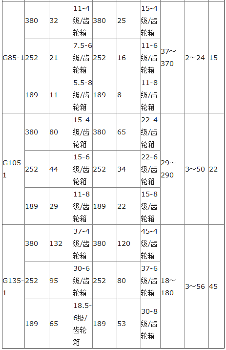 單級,由齒輪變速、電磁調速電機加齒輪變速或無級變速電機加齒輪變速時的性能參數