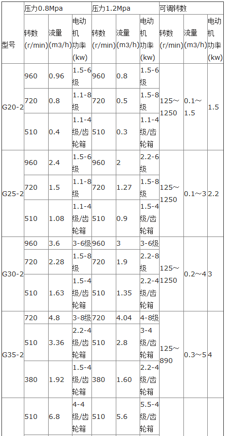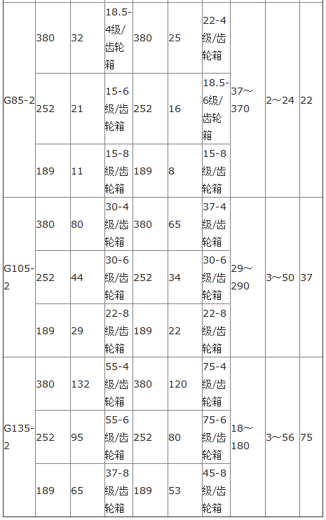 雙級,由齒輪變速、電磁調速電機加齒輪變速或無級變速電機加齒輪變速時的性能參數