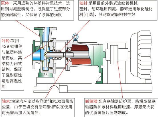 IHF氟塑料離心泵是按標準并結合非金屬泵的工藝設計制造。泵體采用金屬外殼內襯聚全氟乙丙烯(F46),泵蓋、葉輪和軸套均用金屬嵌件外包氟塑料整體燒結壓制而成,軸封采用外裝式的波紋管機械密封,靜環選用99.9氧化鋁陶瓷(或氮化硅),動環采用四氟填充材料,其耐腐耐磨密封性好。泵的進出口均采用鑄鋼體加固,以增強了泵的耐壓性。實際使用顯示,該泵具有耐腐、耐磨、耐高溫、不老化、機械強度高、運轉平穩、結構合理、密封性能嚴格 、拆卸檢修方便、使用壽命長等點。