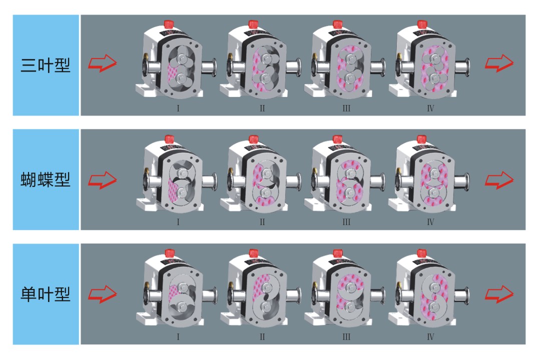 轉子泵又稱羅茨泵、膠體泵、高濃漿泵等,它依靠兩個同步運動的轉子,由一對外置式同步齒輪箱進行傳動,轉子在傳動軸的帶動下進行同步反方向旋轉,從而構成了較高的真空度和排放壓力。兩轉子將轉子室分隔成幾個小空間,并按I-II-III-IV的次序運轉。運轉到I位置時,只有進口處充滿介質;運轉到II位置時,II室中封閉了部分介質;到位置時,III室中也封閉了介質;到位置IV時,進口處和出口室相通,介質即被輸送至出物料管道。按這樣的循環往復,介質即被不斷的輸送出去。