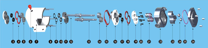 二者同屬容積式泵,所以其性能基本相近--能穩輸送高粘度的物質,都有較高的輸送壓力。但螺桿泵有一大的缺點決定了它在有衛生要求的場合的不適用性-- 由單螺桿泵的非流線型曲面以及腔室內眾多的缺陷決定了它不可能成為衛生級的泵,腔壁四氟或橡校料的損壞 可能對被輸送物質造成污染。而本泵由于轉子的流線結 構以及轉子室中基本沒有死點和非金屬件,故嚴格來說在食品飲料、醫藥等衛生要求較高的行業中,萬用輸送泵 適合應用, 別是現在的生產線的自動化程度越來 越高,同時越來越多的采用了在線( 地)清洗(CIP),這 顯示了選擇虹興牌膠體泵的重要性。